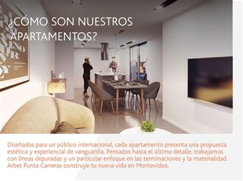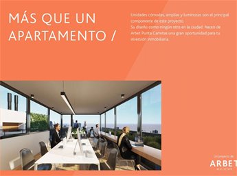 BARRIO PUNTA CARRETAS, Proyecto ARBET, MUY BUENA UBICACION SOBRE 21 DE SETIEMBRE , CERCA DE TODOS LOS SERVICIOS Y CENTROS EDUCATIVOS. Propuestas arquitectónicas innovadoras a la par de una excelente calidad constructiva y finas terminaciones Las unidades se destacan por su amplitud, sus amplios ventanales, su luminosidad, vistas despejadas, amplias terrazas Amplio Living comedor con salida a terraza Cocina integrada con buena capacidad de muebles aéreos y bajo mesada Dormitorio con placards CALEFACCION: Previsión para splits de aire acondicionado AMENITIES: Amplia Barbacoa en azotea con parrillero COCHERAS desde USD28.000- Gastos de Ocupación: 4% (Conexiones, alhajamiento, planos de mensura y reglamento de copropiedad) Comisión Inmobiliaria: 3%+IVA SALDO EN CUOTAS SIN INTERESES HASTA LA OCUPACION POR CONSULTAS Y COORDINACIÓN DE VISITAS FAVOR ENVIAR MENSAJE VIA WHATSAPP O LLAMAR AL CELULAR DE CONTACTO