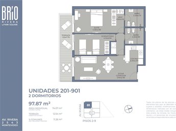 Proyecto BRÍO RIVERA, MUY BUENA UBICACION. Entrega estimada febrero 2027. Propuestas arquitectónicas innovadoras a la par de una excelente calidad constructiva y finas terminaciones. Las unidades se destacan por su amplitud, sus amplios ventanales, su luminosidad, vistas despejadas, amplias terrazas. Cocina integrada con buena capacidad de muebles aéreos y bajo mesada. Dormitorio con placard CALEFACCION: Previsión para splits de aire acondicionado AMENITIES: * Amplia Barbacoa en azotea con parrillero * Gimnasio equipado TIPOLOGIAS: - 1 Dormitorio desde USD 171.487 - 2 Dormitorios desde USD 254.700 - P. House 1 dormitorio USD 202.694 - P. House dormitorio desde USD 325.841 COCHERAS Descubiertas: USD ?? COCHERAS Cubiertas: USD ?? Gastos de Ocupación: 5% (Conexiones, alojamiento, planos de mensura y reglamento de copropiedad) Comisión Inmobiliaria: 3%+IVA El PROYECTO SE REALIZA BAJO LA LEY DE VIVIENDA PROMOVIDA, CON SUS BENEFICIOS EN EXONERACIONES IMPOSITIVAS: * Exoneración de ITP * Exoneración de IVA * Exoneración de IRAE/IRPF en las rentas generadas en alquileres por 10 años * Exoneración de Impuesto al Patrimonio por 10 Años FORMA DE PAGO: Reserva: 10% - Promesa CV: 30% - Durante la Obra: 50% - Entrega: 10% SALDO EN CUOTAS SIN INTERESES HASTA LA OCUPACION POR CONSULTAS Y COORDINACIÓN DE VISITAS FAVOR ENVIAR MENSAJE VIA WHATSAPP O LLAMAR AL CELULAR DE CONTACTO.