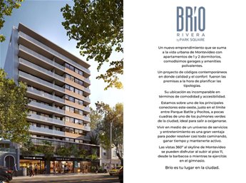 Proyecto BRÍO POCITOS, MUY BUENA UBICACION. Entrega estimada febrero 2027. Propuestas arquitectónicas innovadoras a la par de una excelente calidad constructiva y finas terminaciones. Las unidades se destacan por su amplitud, sus amplios ventanales, su luminosidad, vistas despejadas, amplias terrazas. Cocina integrada con buena capacidad de muebles aéreos y bajo mesada. Dormitorio con placard CALEFACCION: Previsión para splits de aire acondicionado AMENITIES: * Amplia Barbacoa en azotea con parrillero * Gimnasio equipado TIPOLOGIAS: - 1 Dormitorio desde USD 171.487 - 2 Dormitorios desde USD 254.700 - P. House 1 dormitorio USD 202.694 - P. House dormitorio desde USD 325.841 COCHERAS Descubiertas: USD CONSULTAR COCHERAS Cubiertas: USD CONSULTAR Gastos de Ocupación: 5% (Conexiones, alojamiento, planos de mensura y reglamento de copropiedad) Comisión Inmobiliaria: 3%+IVA El PROYECTO SE REALIZA BAJO LA LEY DE VIVIENDA PROMOVIDA, CON SUS BENEFICIOS EN EXONERACIONES IMPOSITIVAS: * Exoneración de ITP * Exoneración de IVA * Exoneración de IRAE/IRPF en las rentas generadas en alquileres por 10 años * Exoneración de Impuesto al Patrimonio por 10 Años FORMA DE PAGO: Reserva: 10% - Promesa CV: 30% - Durante la Obra: 50% - Entrega: 10% SALDO EN CUOTAS SIN INTERESES HASTA LA OCUPACION POR CONSULTAS Y COORDINACIÓN DE VISITAS FAVOR ENVIAR MENSAJE VIA WHATSAPP O LLAMAR AL CELULAR DE CONTACTO.