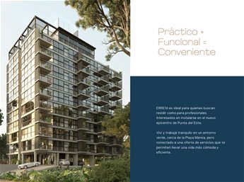 PUNTA DEL ESTE - PROYECTO ERRE 16, MUY BUENA UBICACION SOBRE AV. ROOSEVELT, PARADA 16, A 10 CUADRAS DE PLAYA MANSA, 5KM DE LA PENINSULA, EN EL CERCANIA DE PUNTA SHOPPING, SANATORIO CANTEGRIL, COLEGIOS, UNIVERSIDADES Y TODOS LOS SERVICIOS EXCELENTES AMENITIES Y UNIDADES CON VISUALES UNICAS DE PUNTA DEL ESTE / Entrega de unidades: Diciembre 2027 Propuestas arquitectónicas innovadoras a la par de una excelente calidad constructiva y finas terminaciones Las unidades se destacan por la amplitud de sus ambientes, amplios ventanales, terrazas, vistas despejadas- Inmejorable oportunidad de inversión ya sea como residencia temporal o permanente! TIPOLOGIAS: Lofts, 1 y 2 Dormitorios- Las unidades se entregan ya equipadas con splits de aire acondicionado, horno empotrado, anafe, campana, muebles aéreos y bajo mesada- FORMA DE PAGO: 10% Reserva 20% Compromiso 20% en Cuotas durante la Obra 50% con la ocupación al contado o en cuotas post ocupación AMENITIES: * Piscina exterior y Jacuzzi * Barbacoa con Parrillero * Cowork * Laundry * Bike parking POR CONSULTAS Y COORDINACIÓN DE VISITAS FAVOR ENVIAR MENSAJE VIA WHATSAPP O LLAMAR AL CELULAR DE CONTACTO